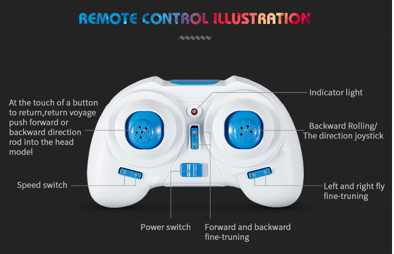 Funkcije: gor / dol / levo / desno / obrat / naprej / nazaj / 360°obrat / samostojna vrnitev / headless način